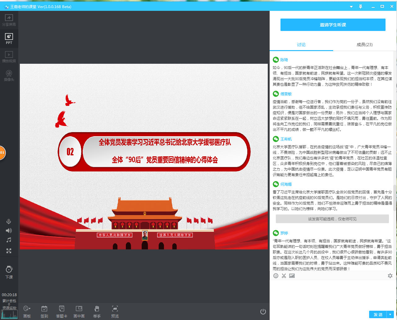 在党课开始之前,全体党员首先进行了“第一议题”的学习,学习习近平总书记给北京大学援鄂医疗队全体“90后”党员重要回信精神。学习完后大家纷纷发表了心得体会,表示要学习他们不畏艰辛、迎难而上、勇于担当的精神。今后要努力成长为有理想、有本领、有担当的新时代青年。