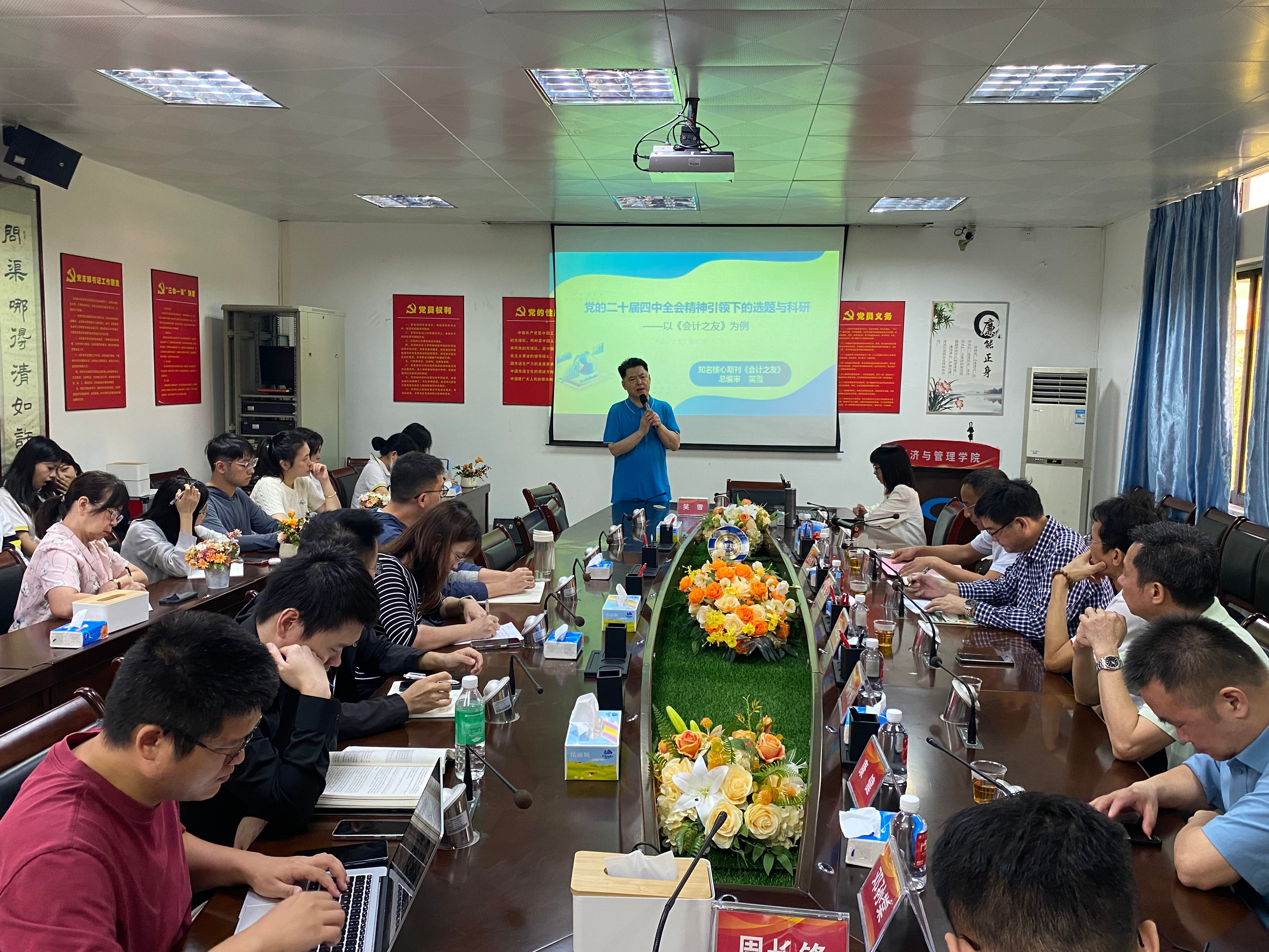 活动现场,笑雪总编审做了《党的二十届四中全会精神引领下的选题和科研》专题讲座。首先,他通过对党的二十届四中全会相关文件内容的深度研读,精准摘取其中与会计、审计、财务管理等密切相关的核心主题词与关键句,并以此为指引,深度剖析了新时代背景下国家战略需求与社科界重点关注的学术前沿方向与政策热点话题。其次,结合《会计之友》多年的办刊经验及刊发文章,由理论分析转向论文写作的实践指导,从题目凝练、结构搭建、逻辑论证、体例规范以及投稿策略等多个维度进行了全面细致地讲解。最后,笑雪强调,高质量的学术研究选题应当是“顶天立地”的——既要“顶天”,通过深入学习全会精神,精准领会国家治理体系建设的重点难点;又要“立地”,通过将上述重要议题与财会实践和社会经济现象紧密结合,在学术研究中准确把握时代的脉搏。